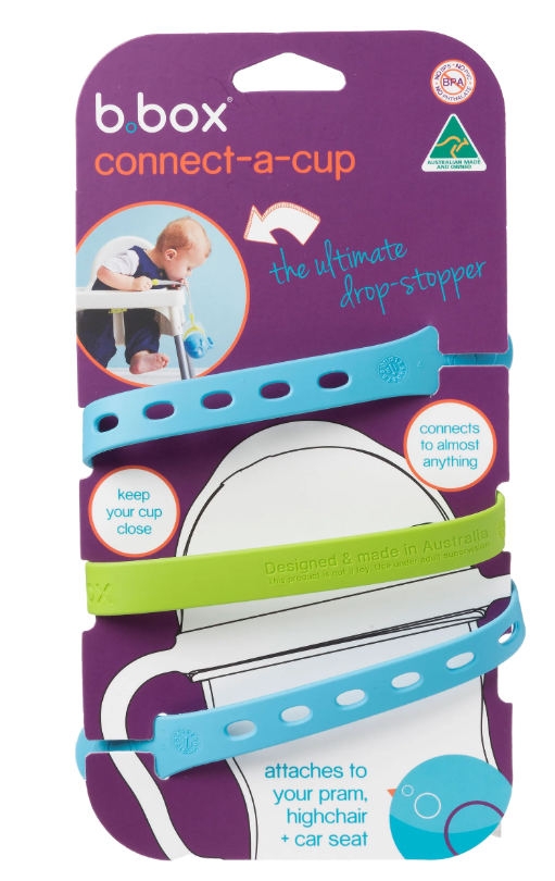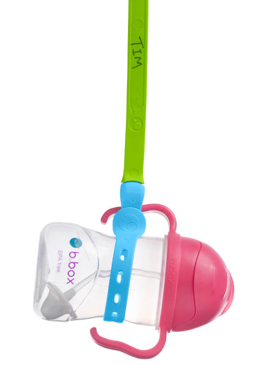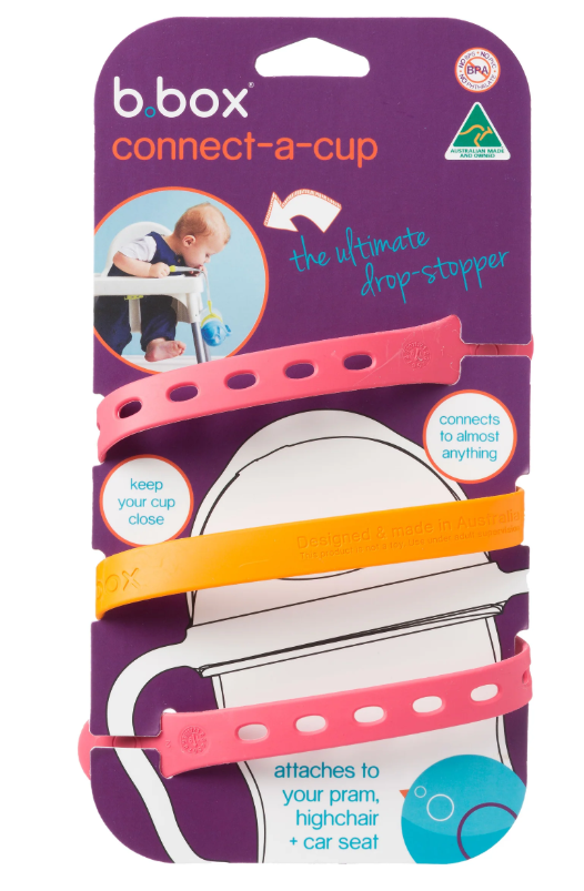 Connect-a-Cup de b.box es una innovadora correa ajustable que mantiene la mamadera, vaso con boquilla o taza al alcance del bebé… ¡y fuera del suelo!