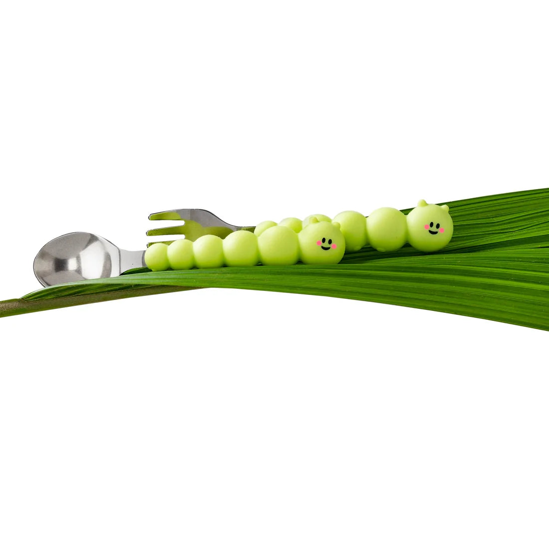 La cuchara y el tenedor con diseño de oruga se convertirán rápidamente en los utensilios favoritos de tu hijo.
