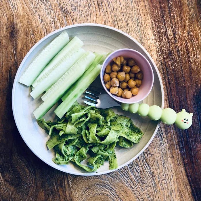 Nuestra cuchara y tenedor con forma de oruga están diseñados para hacer de la hora de comer una experiencia divertida y fomentar la alimentación independiente.
