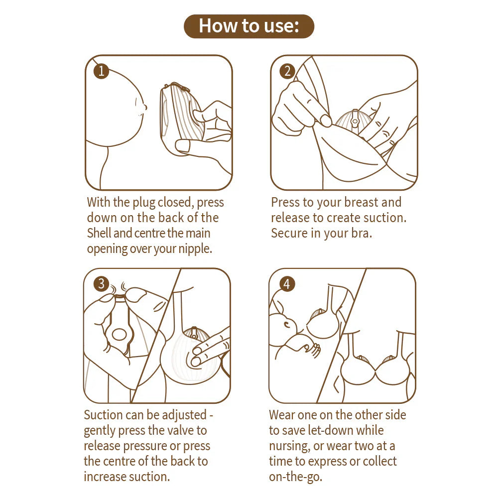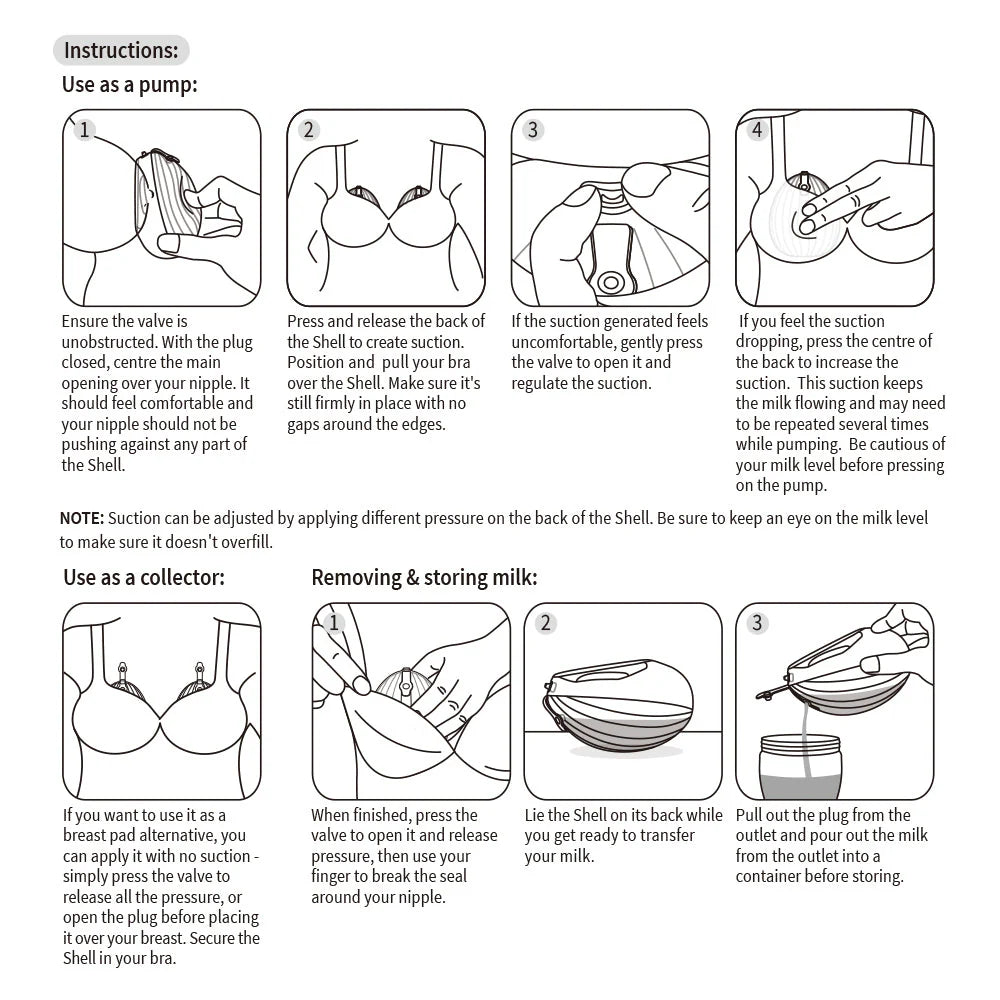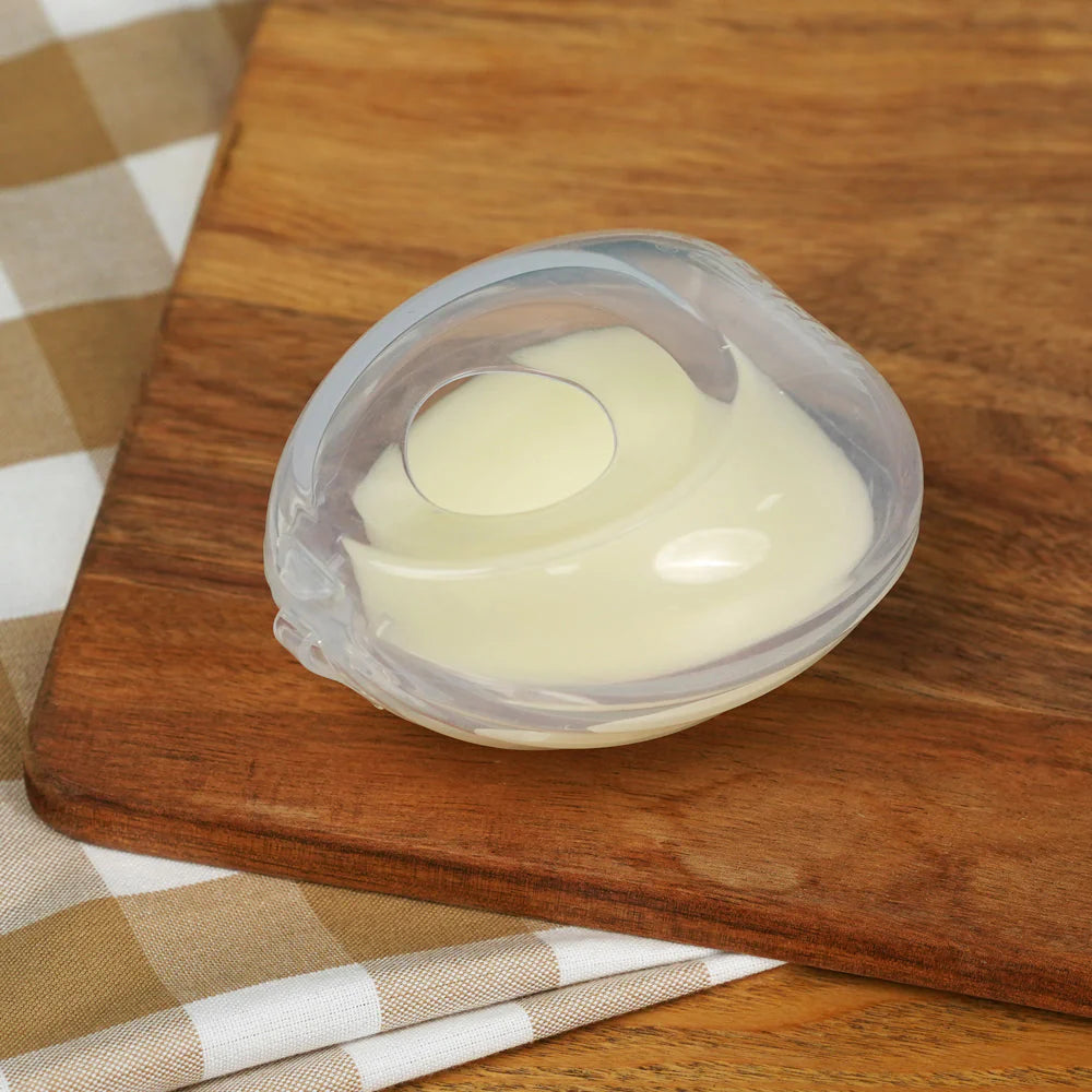 Si prefieres solo recolectar la leche que gotea, basta con retirar el tapón para eliminar la succión, colocar la Shell en el sostén y dejar que capture pasivamente esas valiosas gotas de oro líquido. Su base plana evita derrames y la salida ergonómica permite transferir la leche de forma segura y sin pérdidas.