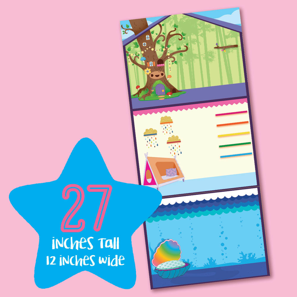 ¡Los niños se divertirán estas escenas mágicas en sus paredes, se adhiere directamente a la pared con la cinta removible y las pegatinas son removibles también! Usarán su perseverancia, creatividad e imaginación para jugar y tener horas de diversión. Simplemente pegue las escenas a la pared, miden en total 68cm de altura y pegue (y vuelva a pegar) las más de 200 pegatinas adhesivas reutilizables.